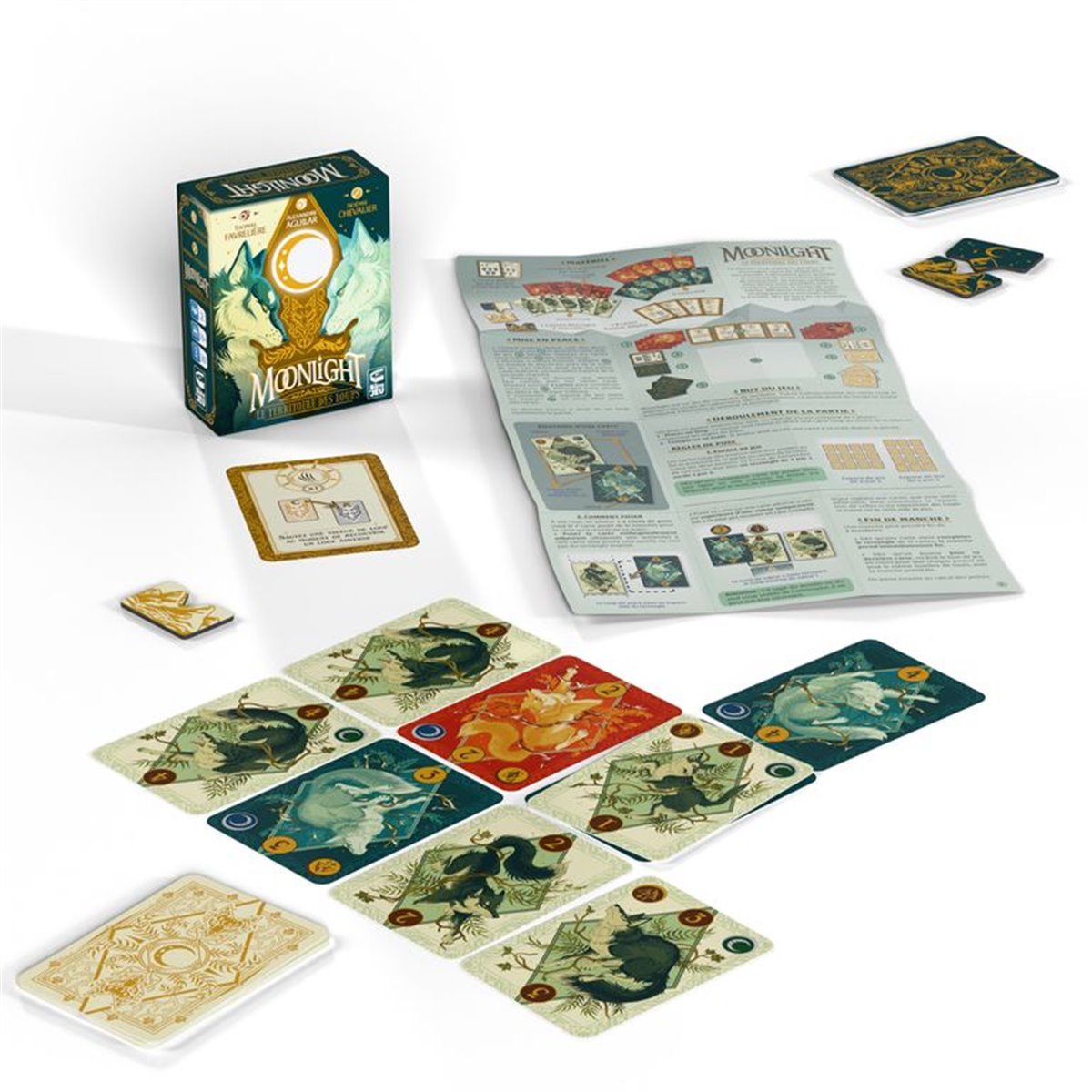 Moonlight – Le Territoire des Loups est un jeu de cartes dans lequel chaque carte représente un de nos loups, de Valeur 1 à 5. À son tour, chaque joueur pose une carte dans une grille aux dimensions 4 × 3 cartes OU 3 × 4 cartes.