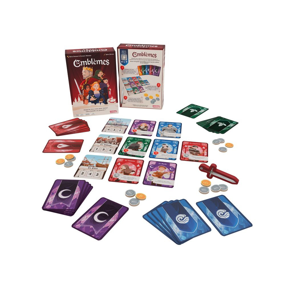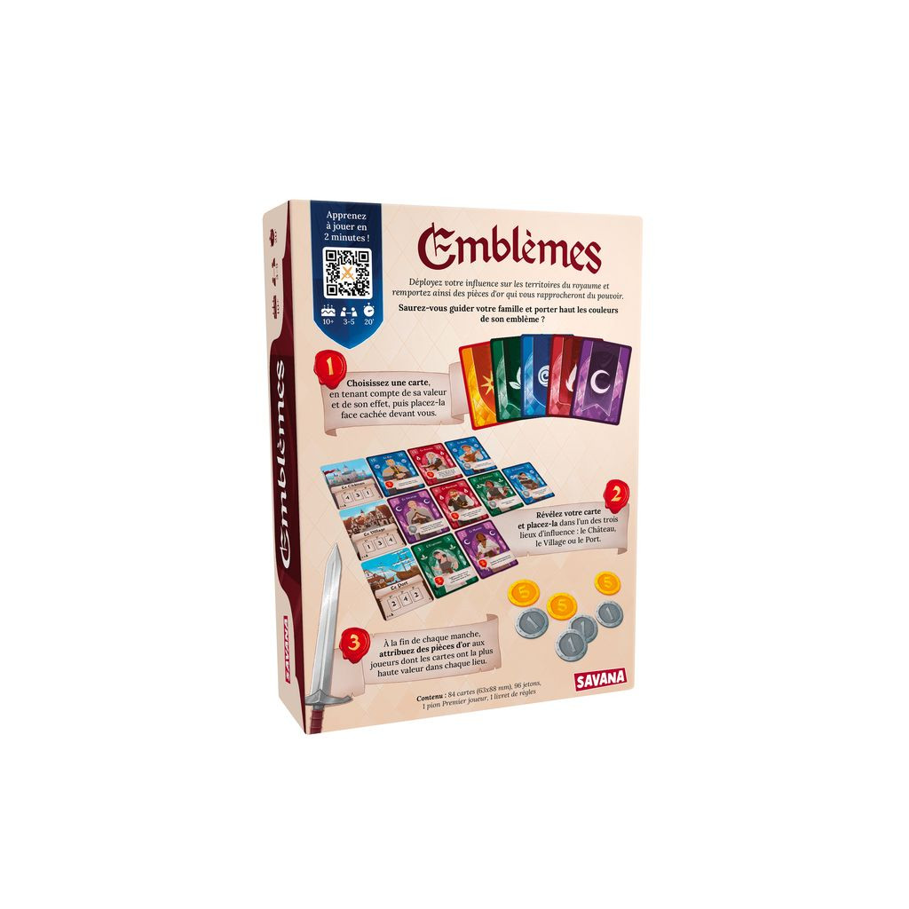 EMBLÈMES est un jeu de cartes qui mêle réflexion stratégique, placements opportunistes et manœuvres sournoises ! Au début de chaque tour, choisissez une carte, en tenant compte de sa valeur et de son effet, puis placez-la, face cachée, devant vous. Puis, l’un après l’autre, révélez votre carte et placez-la dans l’un des trois lieux d’influence : le Château, le Village ou le Port. À la fin de chaque manche, attribuez des pièces d’or aux joueurs dont les cartes ont la plus haute valeur dans chaque lieu. À la fois simple, surprenant et un brin chaotique, EMBLÈMES récompense souvent les joueurs les plus malins (ou les plus audacieux) !