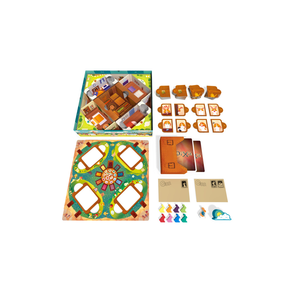 Dixit Kids est un jeu coopératif dans lequel vous devez inviter le plus de lapins possible à l’anniversaire de la Factrice en chef.