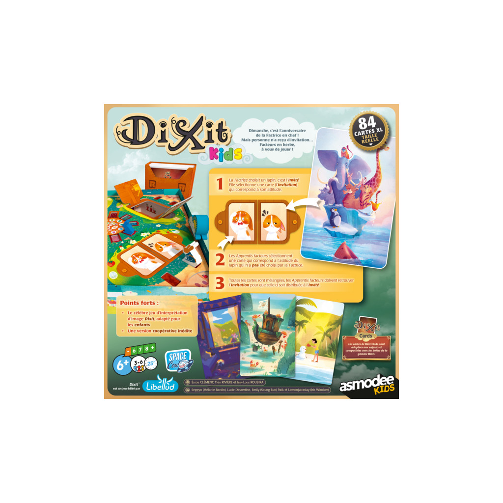 Les 84 Cartes XL du jeu Dixit Kids sont adaptées aux enfants et sont compatibles avec les autres boîtes de la gamme Dixit.